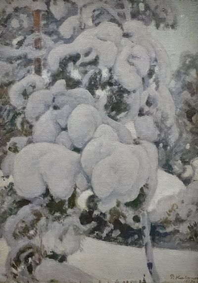 En 1923, Pekka Halonen se rend à Kinahmi, une région sauvage au nord-est de la Finlande. Il y réalise une série de paysages hivernaux dans lesquels le motif de la forêt enneigée s’efface au profit d’une vision quasi abstraite. Les arbres disparaissent sous un épais manteau cotonneux animé de délicates nuances de rose et de mauve. En 1925, le peintre offre Forêt en hiver, Kinahmi au prince Eugène de Suède, lui-même artiste, qui lui rend visite à Halosenniemi. |