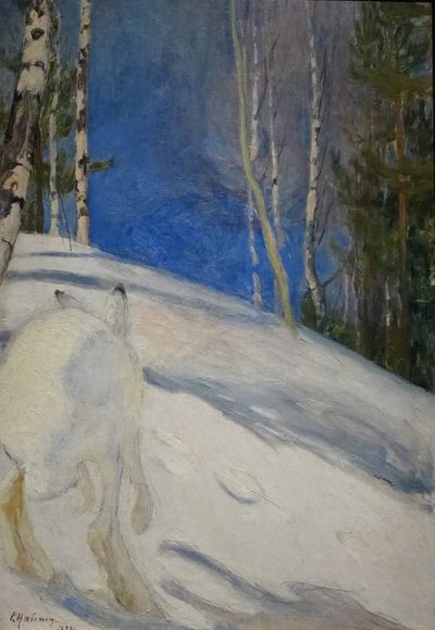 Pekka Halonen peint ses premiers paysages d'hiver en 1895 à Sortavala, sur la pointe nord du lac de Ladoga en Carélie. Malgré des températures très rigoureuses, le peintre travaille plusieurs heures d'affilée en plein air, pour capter les ombres bleutées sur la neige. Cette œuvre se distingue par le motif exceptionnel du lièvre sur la gauche s'échappant dans le paysage. On peut l’interpréter comme un autoportrait de l’artiste fusionnant avec la nature, tel un chamane. |