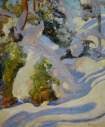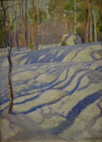 Les paysages de neige de Pekka Halonen correspondent à différents moments de l'année, des premières gelées à la neige de début de printemps, en passant par la lourde couche cotonneuse du plein hiver et l'atmosphère humide de certaines journées. L'observation minutieuse des multiples typologies de neige dans les toiles de Halonen se retrouve dans la variété lexicale associée à la neige dans la langue finnoise, avec plus d'une cinquantaine de termes. Dans ce tableau réalisé au mois de mars, l'artiste s'est concentré sur la représentation des ombres bleutées des arbres sur la neige. |