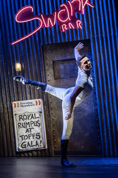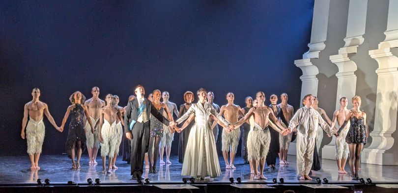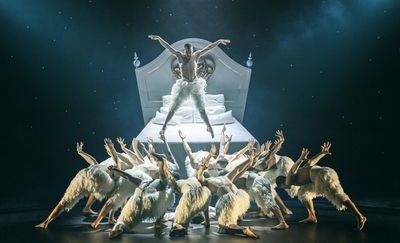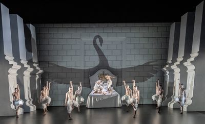 Jackson Fisch (le cygne) et Stephen Murray (le prince) et la compagnie. Photo Johan Persson. |