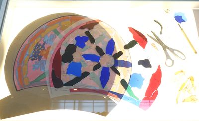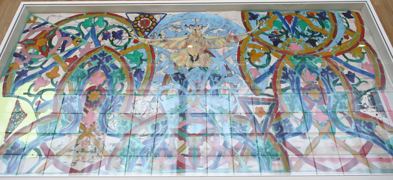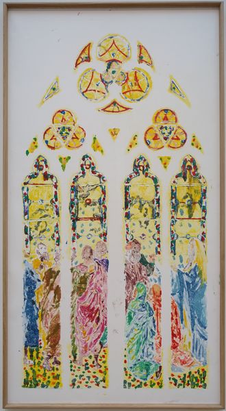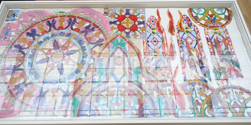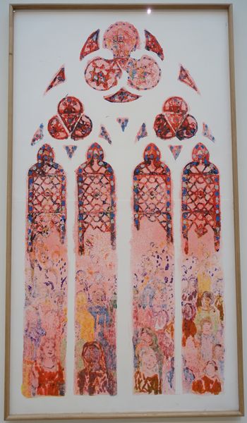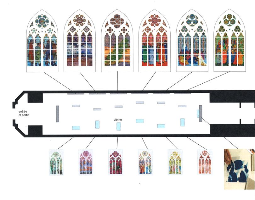 Impression à l'échelle 1 de la maquette de l'artiste. Ce document de travail intègre les impératifs techniques propres à l'art du vitrail (iconographie, composition, couleur, serrurerie, pierre).
