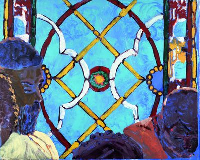J'ai voulu exprimer ici l'intériorité de la prière et du lieu. C'est à partir de cette baie que m'est venue l'idée de faire apparaître, dans chaque vitrail à venir, des vitraux dans les vitraux eux-mêmes, comme un écho visuel qui scande la suite. Les personnages forment un cercle, les yeux clos ou baissés, dans une posture de recueillement. Le visiteur est invité à entrer dans ce cercle, à partager cette unité silencieuse...