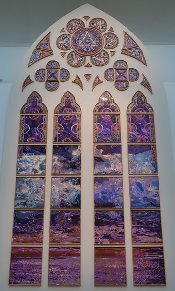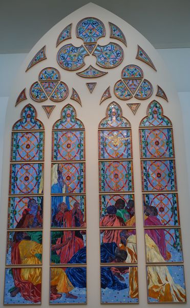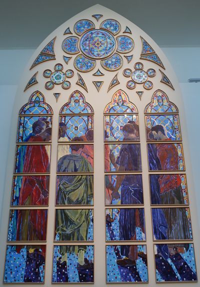 Baie de la chapelle Saint Joseph. « Tous réunis ensemble dans un même un lieu ». 60 encres sur papier assemblées, dimension totale: 700 x 400 cm.