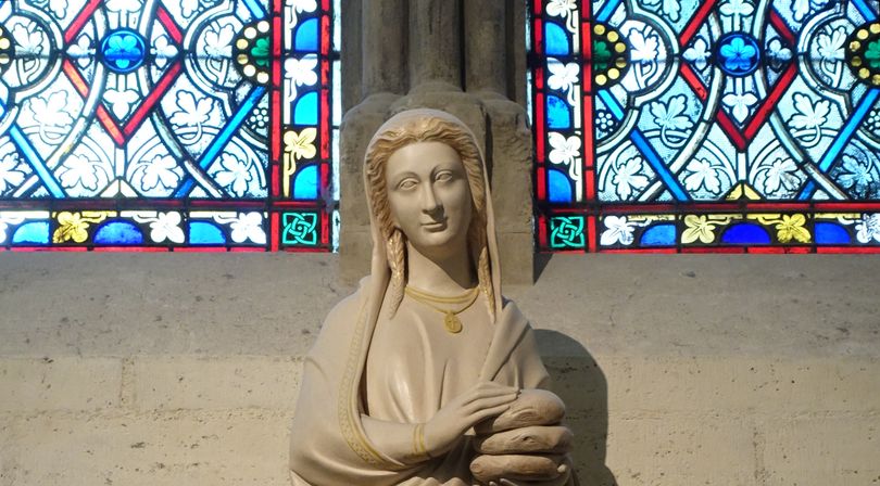 La Vierge Marie est représentée vivante, expressive, non figée. J'ai voulu peindre une femme debout, dont le regard traduit subtilement l'expérience de la vie et de la souffrance. Ses cheveux lâchés, sa posture, sa présence expriment une force intérieure. Ses bras déployés rappellent les ailes d'un oiseau, évoquant une libération spirituelle. Les douze flammes présentes font référence à la Pentecôte. Comme dans toutes les baies, les couleurs (bleu, jaune, rouge) ont été pensées pour créer une neutralité lumineuse, en harmonie avec la lumière globale de la cathédrale.