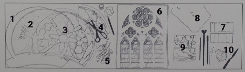 Gabarit pris in situ sur les panneaux de vitraux existants, incluant le positionnement de la serrurerie. Cette étape garantit la précision millimétrique des mesures en atelier.