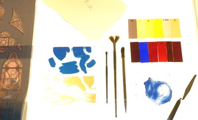 La peinture sur verre (oxydes métalliques) est broyée au couteau-palette avec un liant et des médiums (eau, gomme arabique, vernis Damar, essence de lavande ou de térébenthine). Elle est appliquée avec des pinceaux en poils naturels (petit-gris, martre, blaireau) puis fixée par cuisson.