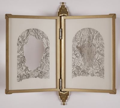 (10) Eva Jospin. Dessin laiton, 2025. Laiton, encre de chine sur papier, plexiglass, 30 x 17 x 3 cm.
