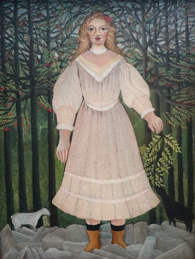 Ce portrait est l’un des plus imposants réalisés par Rousseau. La frontalité du modèle et le décor de rideau évoquent les portraits photographiques de l’époque. Parmi les fleurs en pot, les pensées font probablement allusion à une passion amoureuse. Ce goût du détail symbolique est apprécié par Pablo Picasso, qui le décrit comme l’un «des plus véridiques portraits psychologiques français». Il l’achète pour une somme dérisoire en 1908, et le met à l'honneur lors du banquet qu’il organise pour Rousseau dans son atelier du Bateau-Lavoir, contribuant ainsi à forger sa légende. |