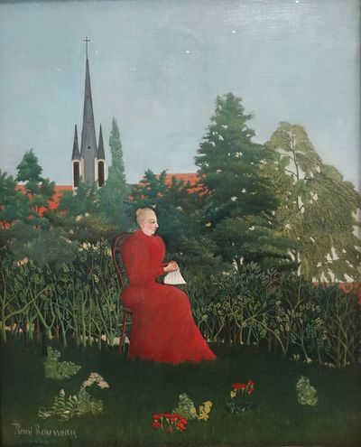 Cette toile, peinte la même année que Le Passé et le Présent, est tout aussi autobiographique et symbolique: les myosotis sont associés au souvenir, tandis que les œillets évoquent le respect, la gratitude et l'amour. La femme pourrait être la mère décédée de Rousseau, Éléonore Guiard, dont il souligne la piété. Si le peintre se vante par ailleurs de ses opinions républicaines et anticléricales, il met ici la croix en évidence et rappelle par la flèche de l’église celle de Laval, sa ville natale. |