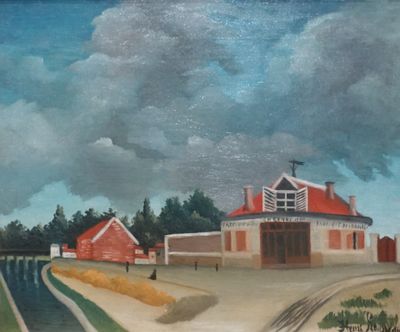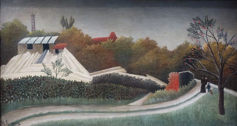 Pendant vingt-deux ans, Rousseau est employé aux services de l'octroi. Il y collecte l’impôt sur les marchandises entrant dans Paris, et peint sur son lieu de travail à ses heures perdues. Il ne représente pas ici un emplacement précis. Les fortifications aux portes de la ville, les bornes en pierre ou les uniformes des deux silhouettes évoquent ce poste qui lui vaudra le surnom de «douanier». |