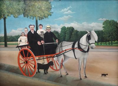 Rousseau réalise probablement ce portrait de famille pour régler ses dettes auprès de Claude Junier, son voisin maraîcher et dresseur de chevaux. S’inspirant de photographies, le peintre s'écarte pourtant de son modèle: il se joue des rapports d'échelle et se représente sur le siège du cocher.