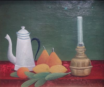 À la fin de sa vie, Rousseau attire l’attention d'artistes de l’avant-garde qui lui rendent visite dans son atelier. C’est pour le peintre italien Ardengo Soffici qu’il réalise cette commande. De taille plus imposante que ses autres natures mortes, il la facture pourtant à une bien modique somme. La composition, ancrée dans la modernité par la découpe des formes sur les aplats de couleurs, est inspirée par la cafetière et la bougie apportées par Soffici en personne. |