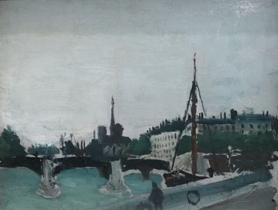 Henri Rousseau (1844-1910). Vue de l'île Saint-Louis prise du pont Henri IV (étude), 1909. Huile sur carton entoilé. Laval, Musée d'Art naïf et d'Arts singuliers. |