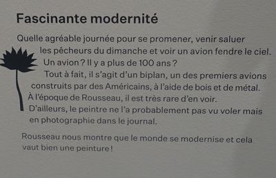 Ces images populaires rencontrent leur public et lui permettent de survivre financièrement. Elles constituent le corpus le plus important de son œuvre, et le plus représenté dans la collection du marchand Paul Guillaume. On y croise les pêcheurs à la ligne et les femmes chapeautées des images d’Épinal dans des points de vue où se décline la modernité. Rousseau s'inspire de ses propres observations lorsqu'il parcourt les environs de Paris, alors en pleine mutation, et rend hommage aux premiers vols du biplan des frères Wright en 1908.