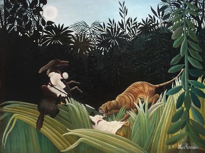 Témoin du succès des expositions de Paul Gauguin après sa mort en 1903, Rousseau remarque l'intérêt du public pour les scènes exotiques. Cette toile est la première de la série dédiée aux combats de jungle, qu'il présente aux Salons, de 1904 à sa mort. Si la plupart des critiques s’émeuvent des proportions irréalistes des figures et du traitement de la lumière, l'œuvre bénéficie d’une attention notable au Salon des Indépendants. Albert Barnes l’achète en 1926. |