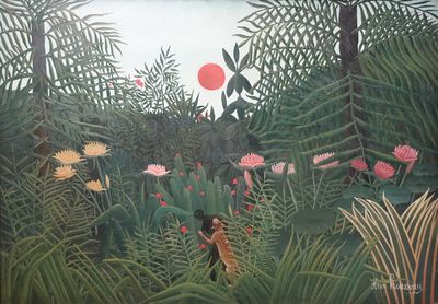 Alors que ses contemporains le croient imprégné des souvenirs d’un voyage au Mexique durant son service militaire, Rousseau reconnaît en 1910 n’avoir en réalité jamais quitté la France. Ses jungles puisent aux sources d’une imagerie exotique populaire, diffusée par les Expositions universelles où s'affirme l'empire colonial français au tournant du siècle. Rousseau s'inspire tout autant des illustrations de presse, tributaires de cette imagerie, que des croquis qu’il réalise dans les galeries du Muséum national d'Histoire naturelle et les serres du Jardin des Plantes, où il observe animaux naturalisés et plantes tropicales.