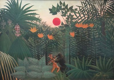 Pour cette composition, Rousseau s'inspire d’une illustration publiée dans la presse, dont il modifie le décor. Il ajoute une végétation luxuriante où abondent bananes, fruits et fleurs. Suite au succès critique rencontré au Salon des Indépendants, Rousseau décline son sujet dans un plus petit format, pour répondre à une généreuse commande. Le tableau reste pourtant invendu et Rousseau se voit contraint de brader les deux versions auprès du marchand Ambroise Vollard. |