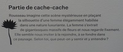 Rousseau décline les motifs stéréotypés qu'il puise dans la presse et les ouvrages illustrés: un homme vêtu d’un pagne et d’une coiffe; une silhouette noire sans traits distinctifs. Le traitement fantaisiste de la végétation, sans réelle profondeur, lui donne un aspect décoratif. Les tons pourpres de la haie d’arbustes soulignent ses qualités de coloriste et font écho à ceux employés dans Forêt tropicale avec jungles. |