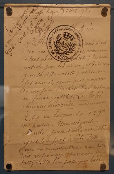 Henri Rousseau. Lettre au maire de Laval, 10 juillet 1898. Laval, musée d'Art naïf et d'Arts singuliers.