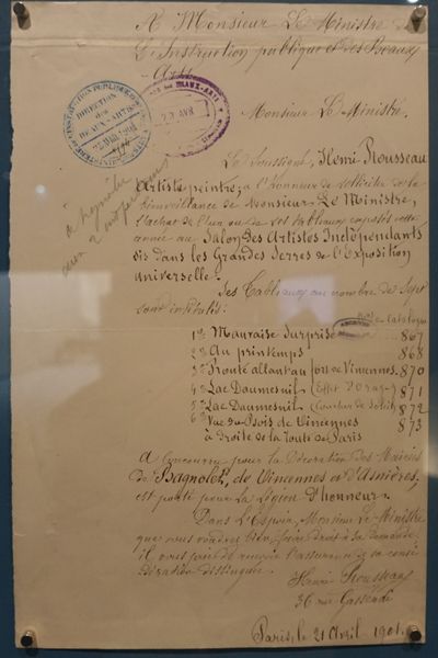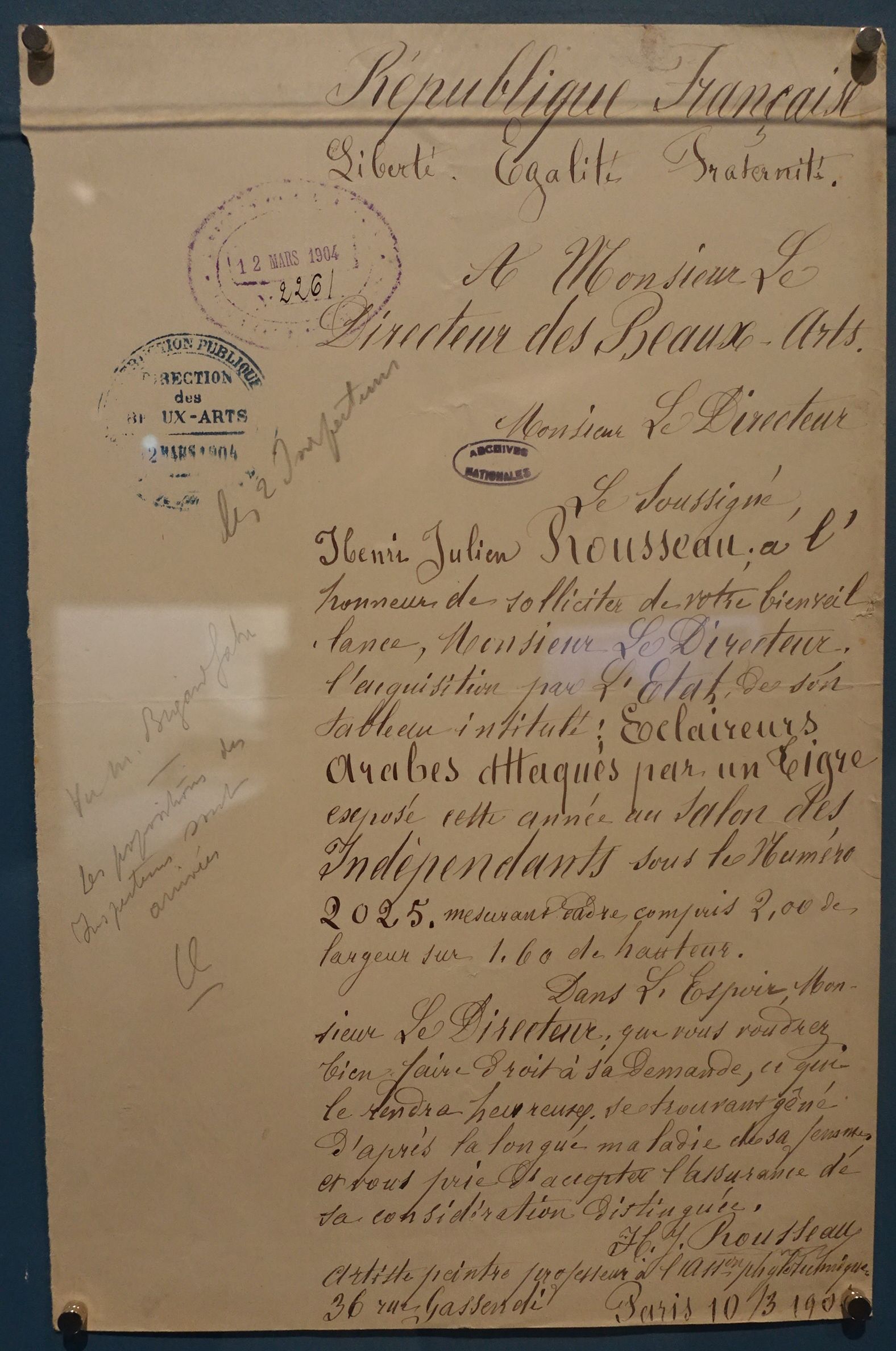Henri Rousseau. Lettre à Monsieur le Directeur des Beaux-Arts, 10 mars 1904. Paris, Archives nationales de France.