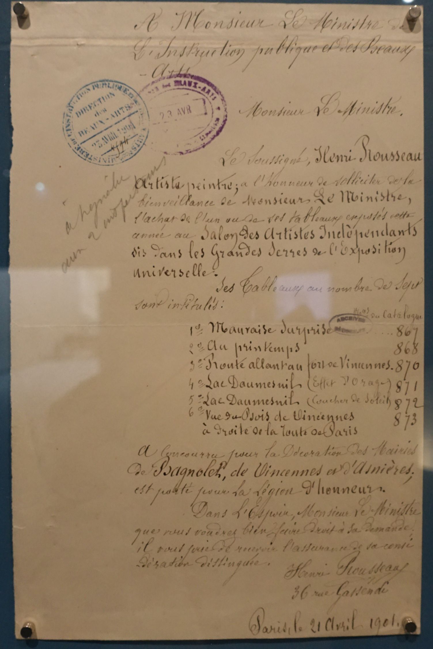 Henri Rousseau. Lettre au ministre de l’Instruction publique et des Beaux-Arts, 21 avril 1901. Paris, Archives nationales de France.