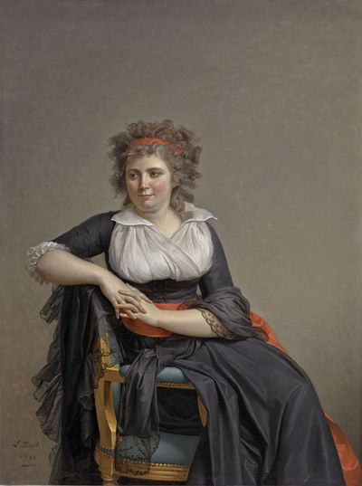 Très tôt, David peint des portraits frappants de vérité, marqués par un goût pour la description, comme ceux de ses beaux-parents, les Pécoul. Puis, il soumet son art à une forme d'épure, en rupture avec l'élégance flatteuse des effigies de Vigée-Lebrun. Éliminant tout accessoire, refusant toute mise en scène, il magnifie l’artifice de la pose d’atelier et s'attache à traduire par son pinceau la singularité de ses modèles se détachant sur un fond neutre et vibrant. Les portraits de Mme Thélusson et Mme d’Orvilliers en sont les chefs-d’œuvre, tout comme celui inachevé de Mme Trudaine, peint en 1791, aux couleurs de la Révolution: le bleu, le blanc et le rouge. |