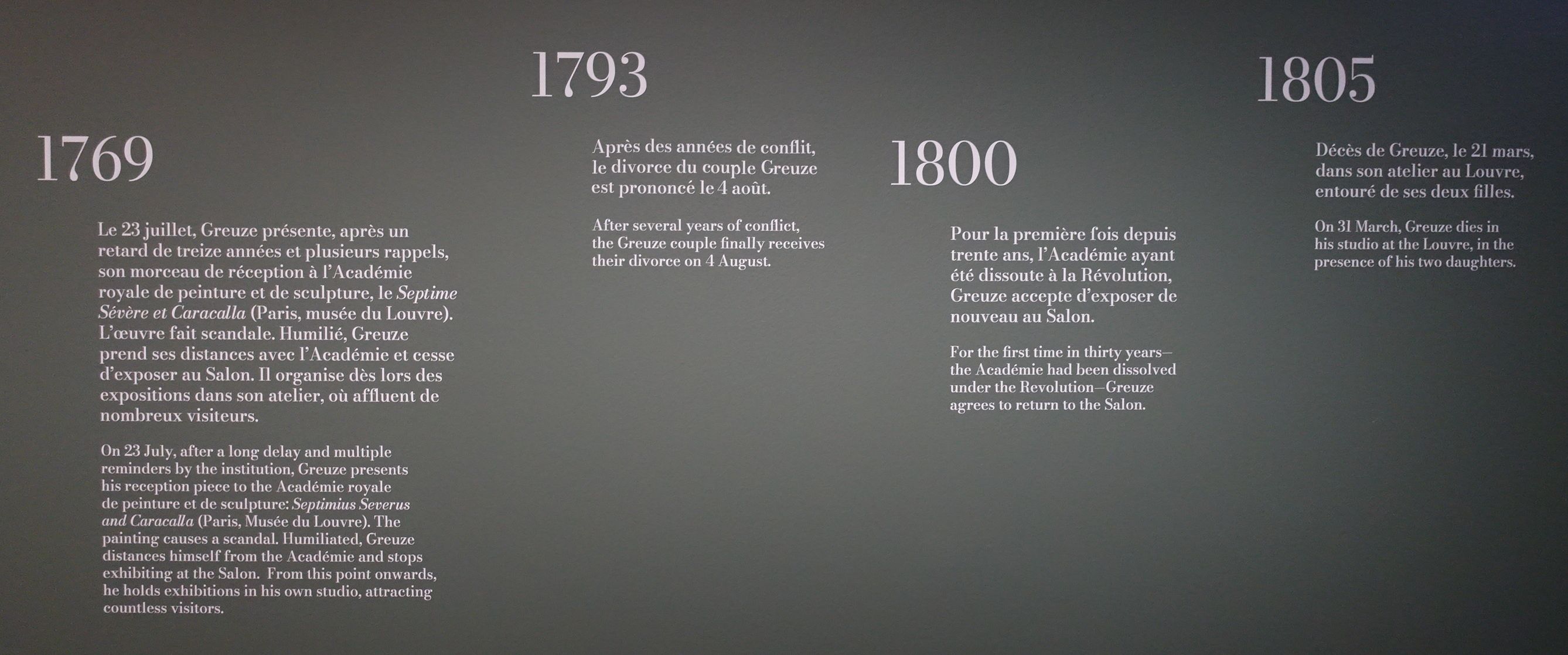 La présentation du morceau de réception de Jean-Baptiste Greuze à l’Académie royale de peinture et de sculpture le 23 août 1769, avec treize ans de retard, représente l’un des épisodes les plus douloureux de la vie du peintre. Contre toute attente, le sujet présenté n’est pas l’une de ses scènes domestiques qui ont contribué à sa renommée, mais une histoire de l’antiquité romaine : l’empereur Septime Sévère reprochant à son fils Caracalla d’avoir tenté de l’assassiner durant les campagnes d’Angleterre. Le peintre représente l’instant où l’empereur convoque son fils pour le confronter à l’atrocité de son acte: «si tu désires de me tuer, tue-moi ici», lui aurait-il dit en pointant l’épée posée sur la table. Loin de mettre en image le courage du père indifférent à la mort, Greuze représente la faute de l’empereur. Car ce dernier, en refusant de condamner son fils criminel, se rend responsable de la décadence de l’Empire romain.