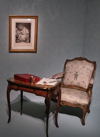 - Anonyme. Attribué à Bernard II VVan Riesen Burgh. Table à écrire, vers 1755 - 1765. Bois, marqueterie, bronze, dorure. Paris, Petit Palais.