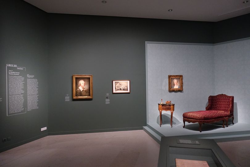 De manière singulière, Greuze n’a de cesse d’entrelacer son œuvre et sa propre vie. Aux Salons de l’Académie royale de peinture et de sculpture, temps fort de l’art contemporain à Paris, le peintre n’hésite pas à présenter le portrait de ses intimes : celui d’Anne-Gabrielle Babuty qu’il épouse en 1759, celui de son beau-père, François-Joachim Babuty, un riche libraire de la rue Saint-Jacques, ou encore ceux de ses filles Anne-Geneviève (dite Caroline) et Louise-Gabrielle. Il n’oublie pas non plus de représenter dans les bras de sa fille l’animal chéri de la famille, un petit épagneul, l’un des chiens les plus à la mode au XVIIIe siècle.