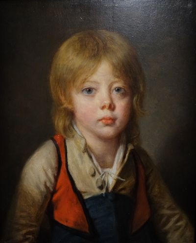 Observez le portrait de ce petit garçon portant un gilet rouge sur une chemise et un pantalon haut. L'artiste représente probablement le garçon d’une famille riche, travesti en paysan. Les vêtements fonctionnels empruntés aux vestiaires des paysans et des marins sont adaptés pour les enfants. Le charmant portrait de ce garçon aux cheveux longs répond à la mode du retour à la simplicité, encouragé par Rousseau.