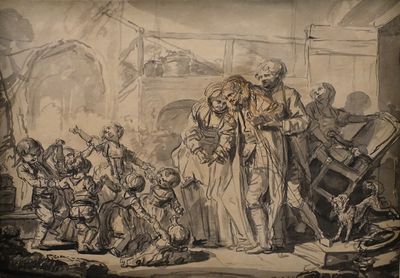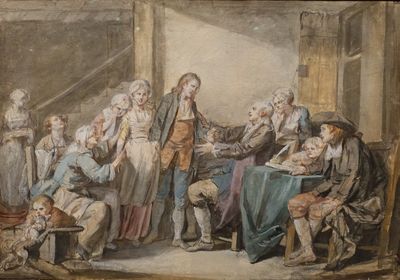 Ce dessin est une étude préparatoire de l'une des compositions les plus célèbres de Greuze, L’Accordée de village (Paris, musée du Louvre). Il représente le père remettant à son gendre, en présence d'un notaire, la dot de sa fille. Greuze se plait à décrire l'éventail des réactions des membres de la famille, oscillant entre émotion, joie, tristesse, crainte ou jalousie. Exécutée dans une gamme de lavis bruns et gris, cette étude aurait été réalisée pour le marquis de Marigny, le puissant directeur des Bâtiments du roi et commanditaire du tableau. Ce dessin, très abouti, a été précédé de nombreuses autres études. Il constitue la dernière étape préparatoire avant l’exécution du tableau. |