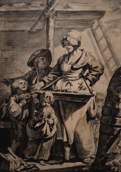 Jean-Baptiste Greuze. La Marchande de pommes cuites, vers 1760. Lavis gris et brun sur papier vergé. Bâle, collection particulière. |