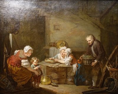 Dans cette scène de genre - l'une des premières connues de Greuze - l'artiste explore déjà le thème des rituels familiaux les plus simples. Deux jeunes filles s'affairent à écosser des pois, que leur apporte un homme (la figure paternelle?). Au premier plan, un petit garçon s'apprête à boire un bol de bouillon ou de gruau, tandis que sa mère, à ses côtés, le retient d’une main protectrice. Ce tableau était à l'origine accompagné d'un pendant, aujourd’hui perdu, représentant une mère allaitant son enfant. Le dialogue des deux tableaux mettait en scène les relations entre une mère et son enfant. |