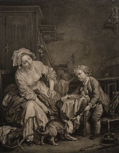 Cette estampe, réalisée d'après L'Enfant gâté (Saint Pétersbourg. musée de l'Ermitage), représente très probablement le pendant du Silence! exposé ici. Alors que ce tableau montre un foyer bien tenu dans lequel une mère impose de bonnes manières à ses enfants, L'Enfant gâté illustre les résultats de l'indulgence parentale. Dans une cuisine en désordre jonchée d'ustensiles, une mère sourit, rêveuse et distraite, tandis que son enfant donne ouvertement son repas au chien de la famille. |
