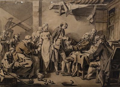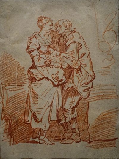 Ce dessin témoigne d'une première idée pour L’Accordée de village (Paris, musée du Louvre), une œuvre qui attirera une foule sans précédent au salon de 1761. Exécutée rapidement, avec une grande facilité, cette étude est travaillée en couleurs – une pratique relativement rare chez l'artiste. Elle a appartenu au célèbre collectionneur Jean de Jullienne, qui la conservait soigneusement encadrée sous verre.