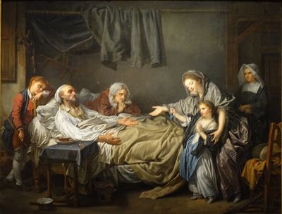 Cette étude représente une première pensée pour la toile présentée deux ans plus tard au Salon de 1768. Le sujet singulier, un père entouré de sa famille à l'approche de la mort, pourrait avoir été inspiré de la lecture d'un texte de Diderot de 1757: le célèbre philosophe y explique que le plus sublime des sujets domestiques serait les «mots d'un père qui dirait à son fils qui le nourrissait dans sa vieillesse: "Mon fils, nous sommes quittes. Je t'ai donné la vie, et tu me l'as rendue".» |