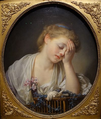 Jean-Baptiste Greuze. Jeune Fille pleurant son oiseau mort. Signé daté en bas à droite: «J. Greuze, 1757», 1757. Huile sur toile. Paris, collection Farida et Henri Seydoux.