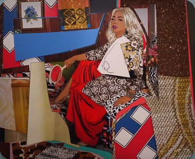 Mickalene Thomas. Celie, 2016. Sérigraphique et peinture acrylique sur miroir acrylique, monté sur panneau de bois, 152,4 x 181,88 cm. Collection privée. |