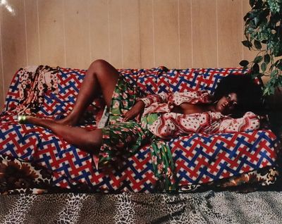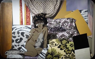 Din, l’une des muses de longue date de Mickalene Thomas, est ici représentée dans une scène intime, entourée d’un riche décor de textiles à motifs.