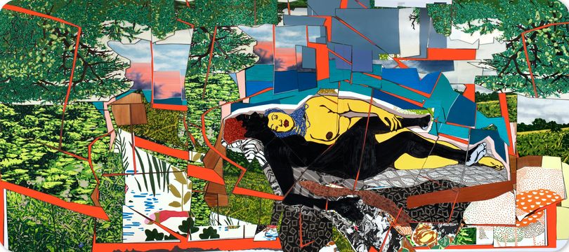 Mickalene Thomas. Landscape with Camouflage, 2011. Photographie couleur et collage sur papier sur carton d’archivage, 41,91 x 47,63 cm. Courtesy de l’artiste. |