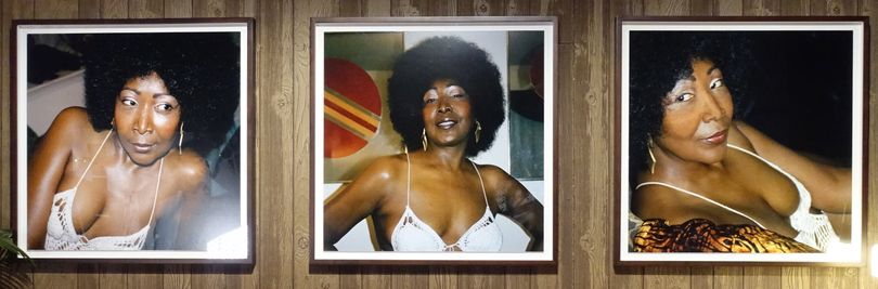 Sous son objectif, les modèles posent dans des tenues choisies ou créées par l’artiste, comme pour l’œuvre Déjeuner sur l’herbe : trois femmes noires. Mickalene Thomas entretient un rapport intime à la mode, qui lui vient d’abord de sa mère mannequin, Sandra Bush, présente dans deux photographies de cette salle. Elle envisage le style vestimentaire comme un geste radical d’affirmation de soi. Les tenues de ses modèles – vêtements aux couleurs vives et aux motifs complexes – vont directement puiser dans l’esthétique «super-fly» [issue des films blaxploitation] des années 70, étroitement liés à l’émancipation des noirs américains dans le sillage du mouvement de lutte pour les droits civiques. Utilisées au départ comme de simples ressources pour ses peintures, les photographies deviennent ensuite des œuvres à part entière, au côté des collages qui témoignent ici de l’étendue de son travail, depuis les pochettes d’album jusqu’aux illustrations d’articles et à ses propres prises. Quant à ses modèles, on compte parmi les plus notables sa mère, mais aussi la chanteuse Solange Knowles et l’artiste Carrie Mae Weems.