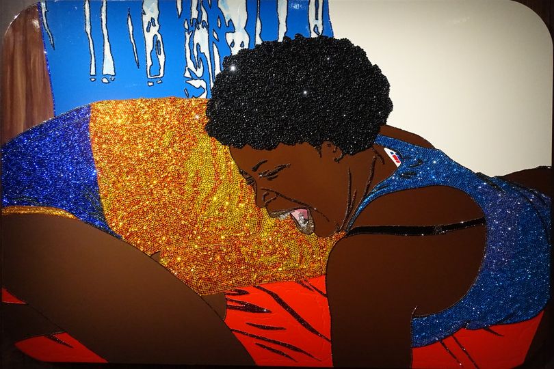 Mickalene Thomas. Untitled #12, 2015. Strass, acrylique et huile sur toile. Collection privée. |