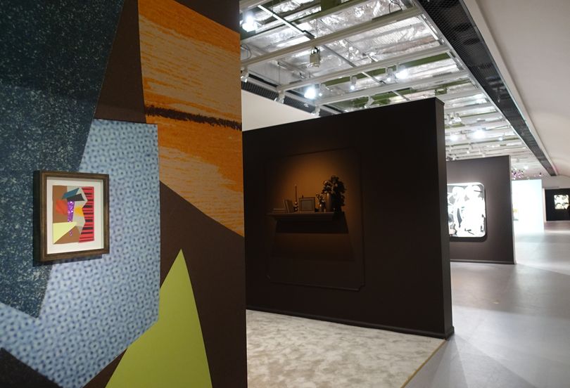 Mickalene Thomas assise dans l'installation ci-dessus durant les interviews des journalistes. Photo Spectacles Sélection. |