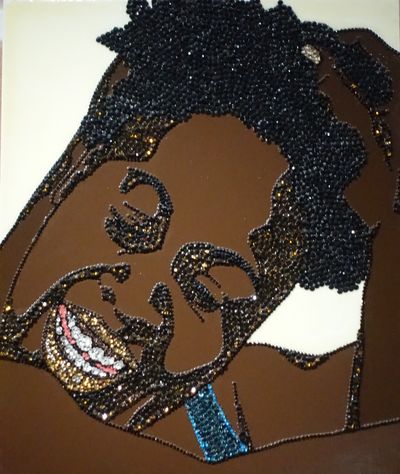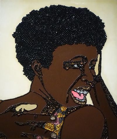 Mickalene Thomas. Portrait of Aaliyah, Night on the Town, 2008. Strass, acrylique et émail sur panneau, 183 x 117 cm. Collection privée. |