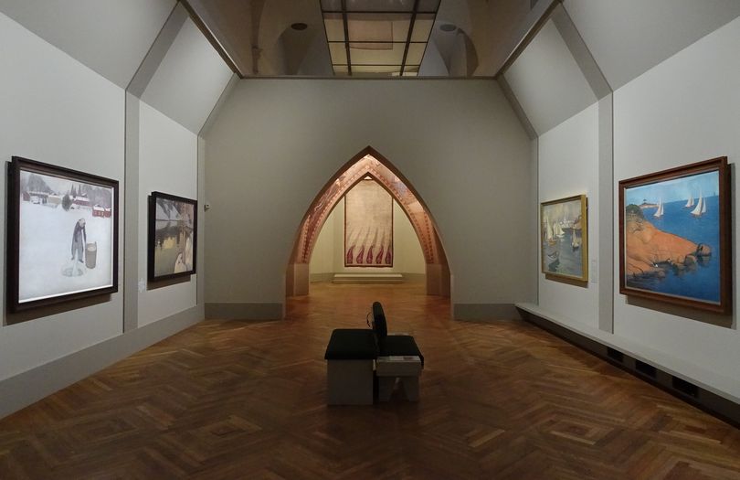 Akseli Gallen-Kallela s'impose comme le chantre de l’âme finlandaise, à travers les quatre fresques qu’il réalise pour orner les voûtes du hall d'entrée, inspirées de l'épopée nationale du Kalevala. Le peintre s'illustre également dans le domaine des arts décoratifs, avec la salle dédiée à la manufacture Iris. On peut y admirer plusieurs meubles et textiles réalisés sur ses dessins, notamment le Ryijy Flamme, une tenture à la composition dynamique et stylisée d’une grande modernité. |