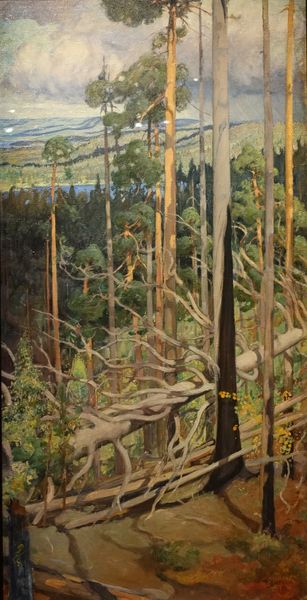Grand pin de Kotavuori est l'une des œuvres les plus radicales de Pekka Halonen en matière de cadrage: la puissante diagonale projette le spectateur dans le tableau, le faisant fusionner avec l'arbre. L'image de ce pin abattu aux branches entremêlées témoigne de l’empathie de l'artiste avec la nature. Conscient de l'exploitation des ressources naturelles pour l’industrie du bois en pleine expansion, le peintre alerte avec ce portrait d'arbre sur l'inévitable dégradation de cet environnement sauvage. |