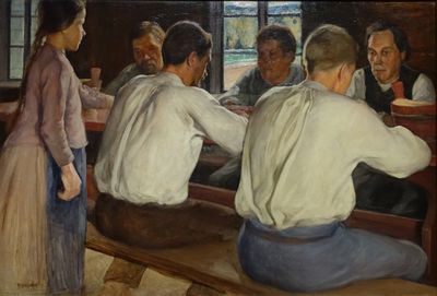 Lors de son premier séjour à Paris en 1890, Pekka Halonen trouve dans les œuvres naturalistes de Jules Bastien-Lepage et de Jean-François Millet le même idéal d'une coexistence harmonieuse entre l’homme et la nature. Il développe cette conception dans plusieurs tableaux, notamment Les Faucheurs. Peinte durant l'été 1891 à son retour en Finlande, l’œuvre représente des paysans travaillant paisiblement dans un champ ensoleillé. C’est le propre frère de l'artiste qui a posé pour la figure du premier plan. |