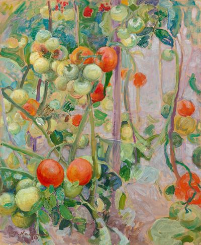 Les Tomates sont emblématiques du mode de vie domestique de Pekka Halonen dans les années 1910 et de son évolution vers un art plus coloré sous l'influence des tendances fauves et néo-impressionnistes. Les toiles de ces années dégagent un sentiment d'allégresse témoignant de la joie de vivre du peintre, ancré dans cette nature qu'il aime tant. Les tomates font la fierté de l'artiste et lui valent même un prix. À l'automne, les plants gagnent l'atelier, dont la grande baie leur prodigue suffisamment de lumière pour croître. |