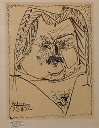 Le deuxième est Picasso, lui aussi bourreau de travail, qui réalise plus d’une dizaine de portraits de Balzac pour illustrer le frontispice du Père Goriot en 1952. D’une version à l’autre, sa vision évolue constamment vers une forme de plus en plus simplifiée.